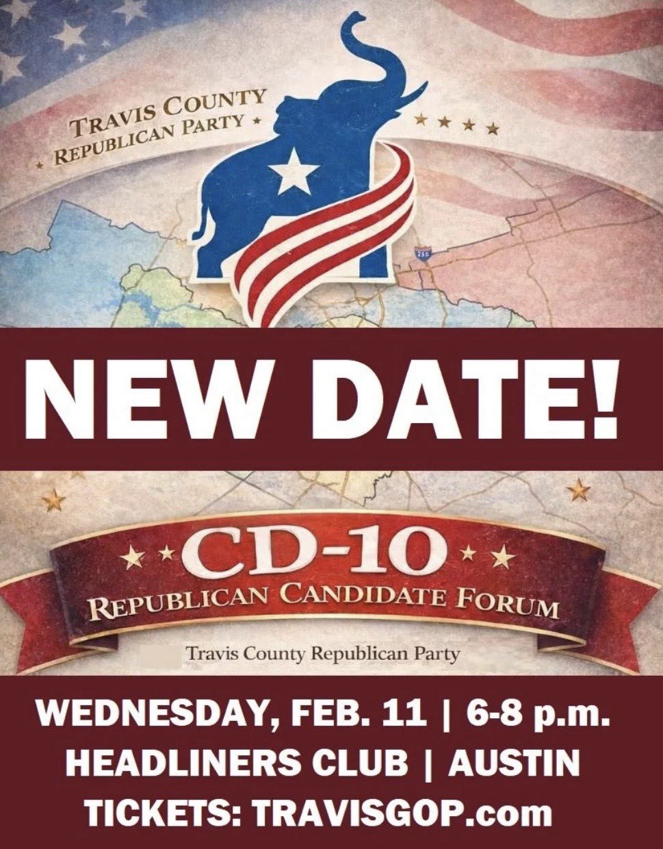 Join the Travis County Republican Party for the CD-10 Republican Candidate Forum on Wednesday February 11th, from 6:00 to 8:00 PM at the Headliners Club in downtown Austin. This event is expected to be one of the largest CD-10 Republican gatherings in Travis County this cycle and will bring voters together to hear directly from […]